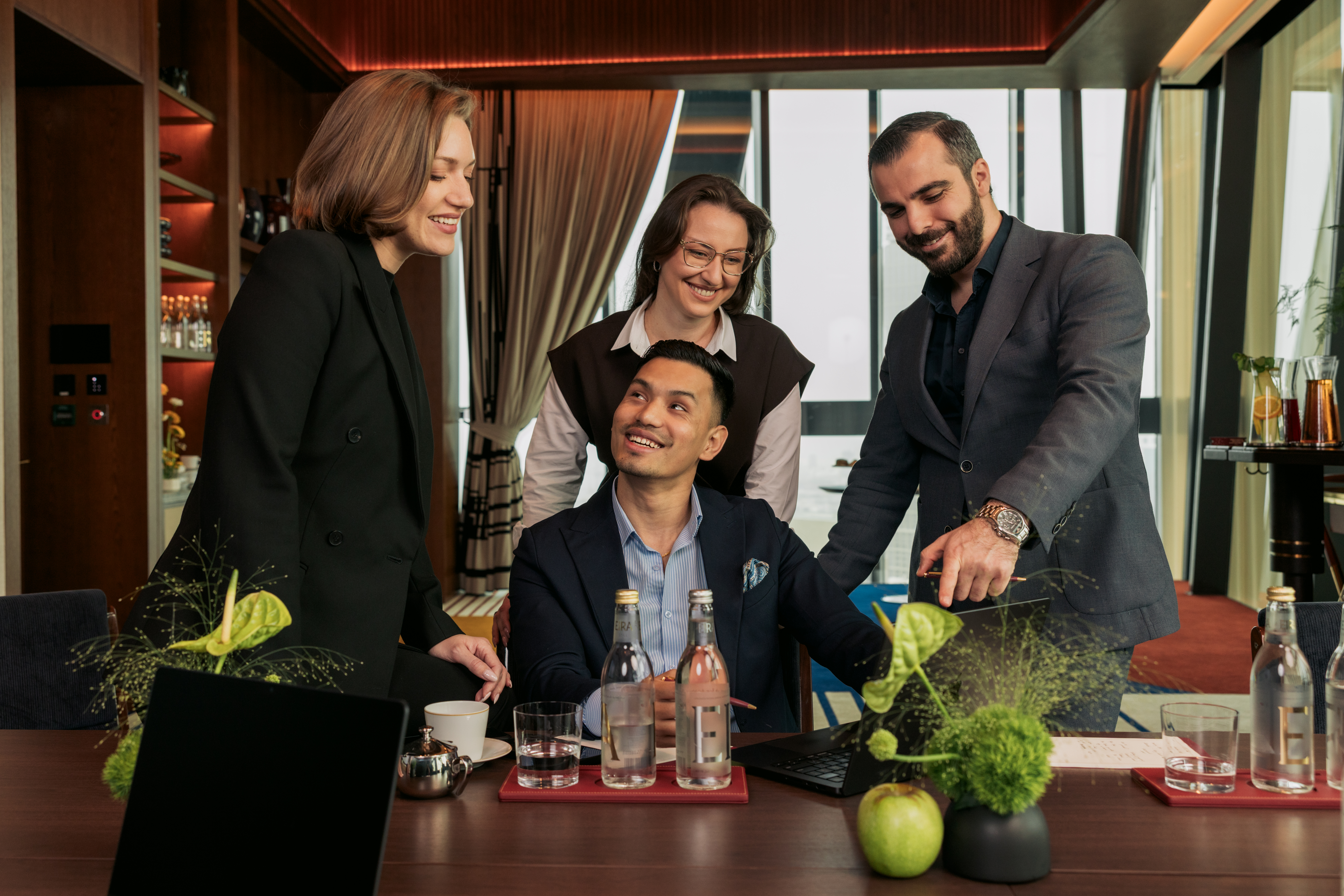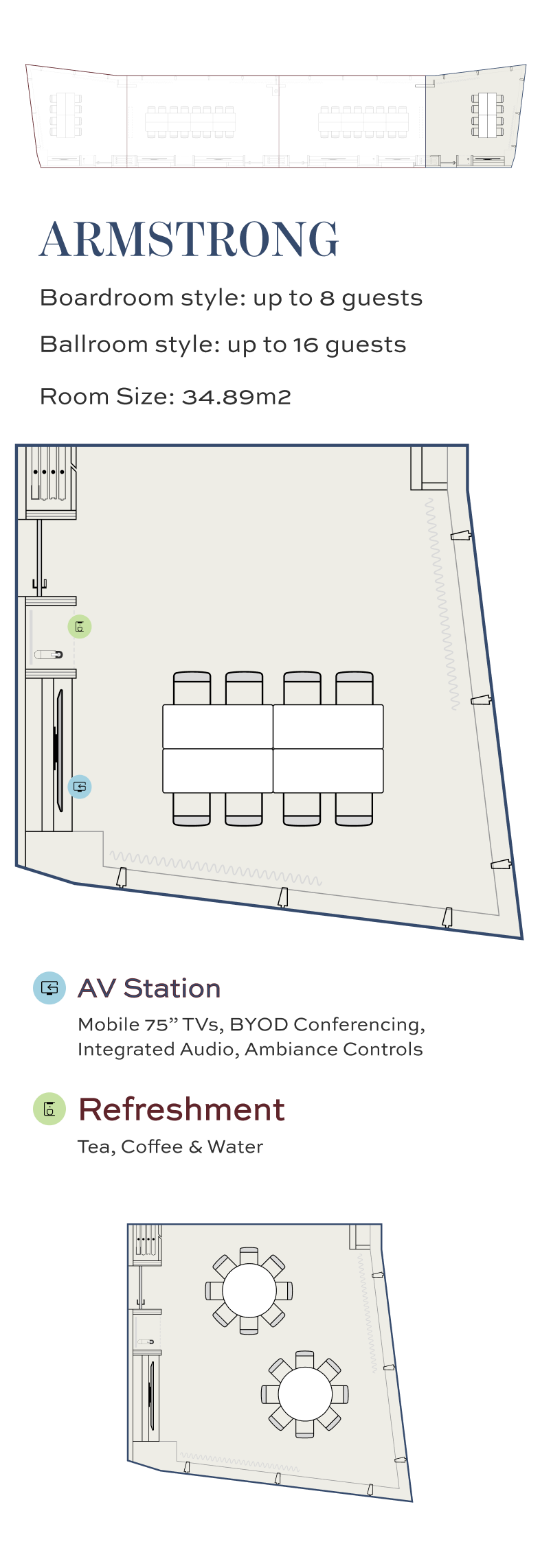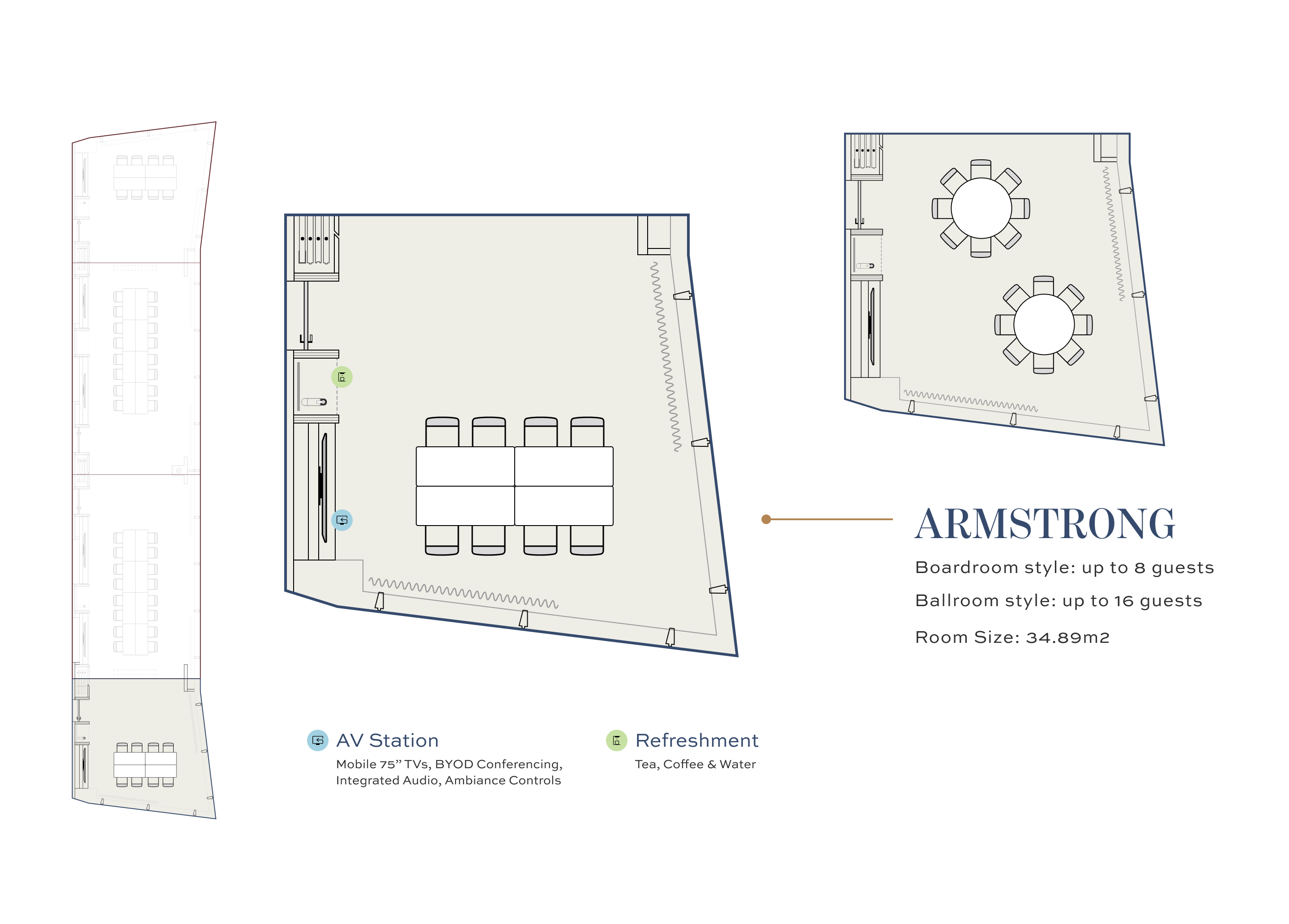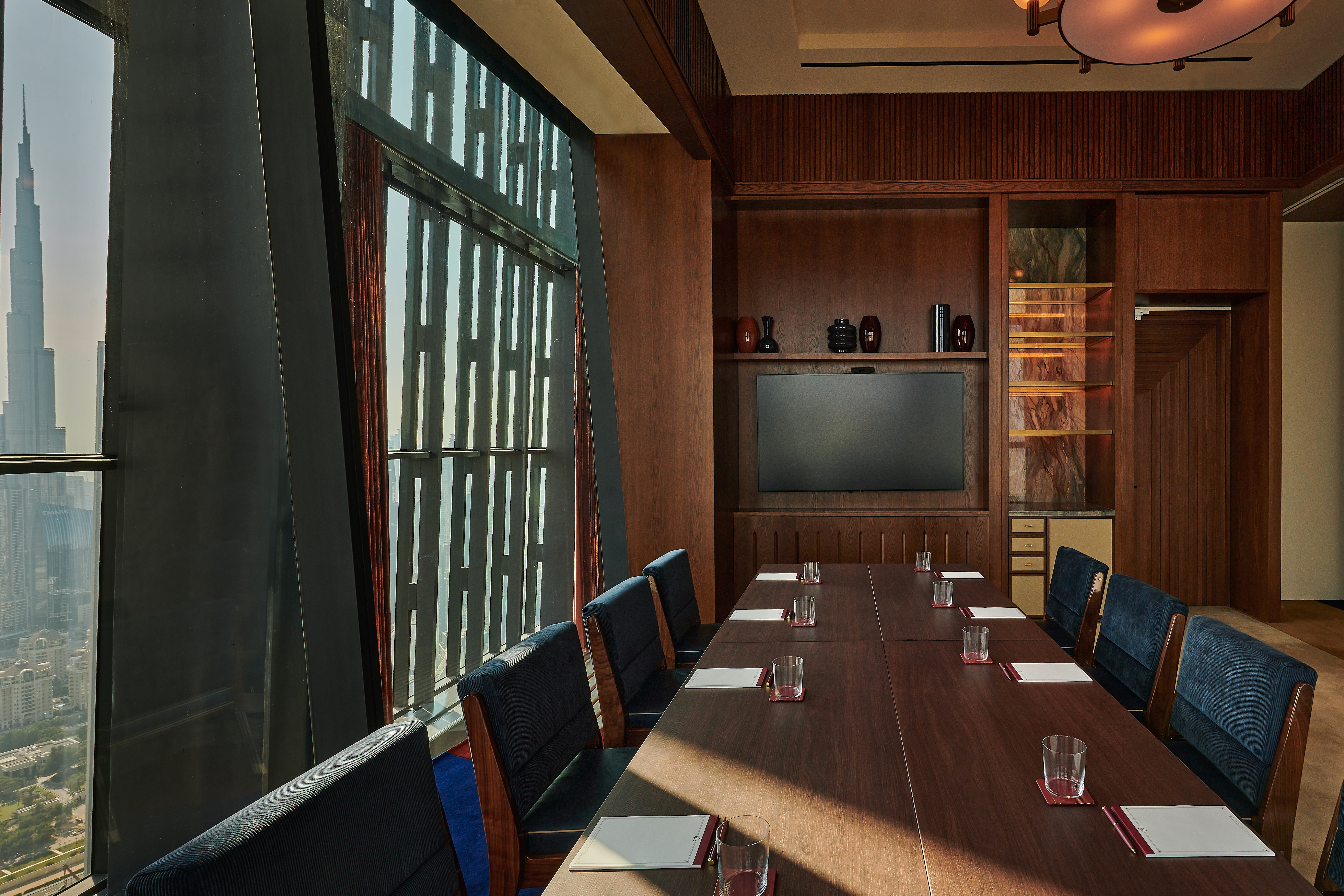 Equipped with full audiovisual capabilities, the room effortlessly transitions between business-style meetings and more personal, memorable occasions.