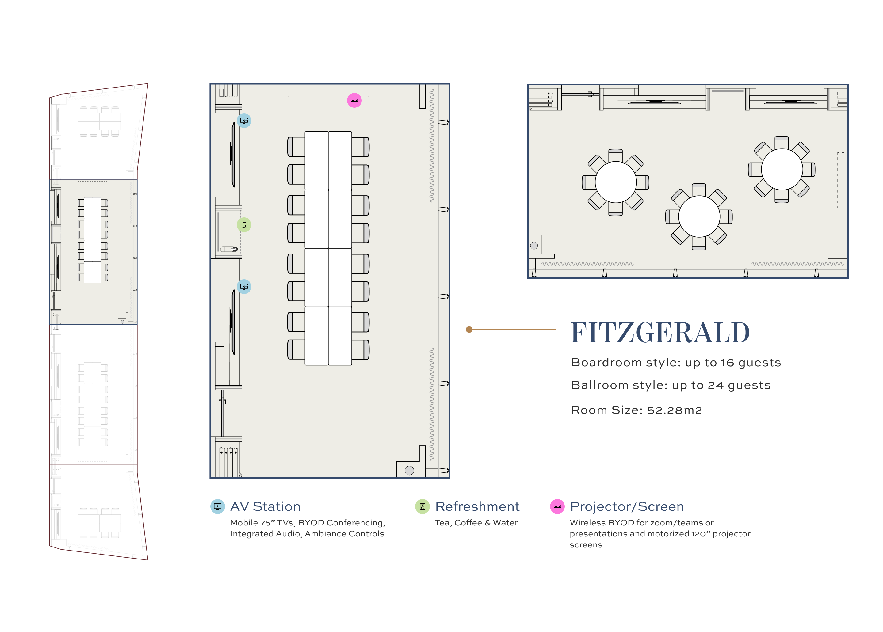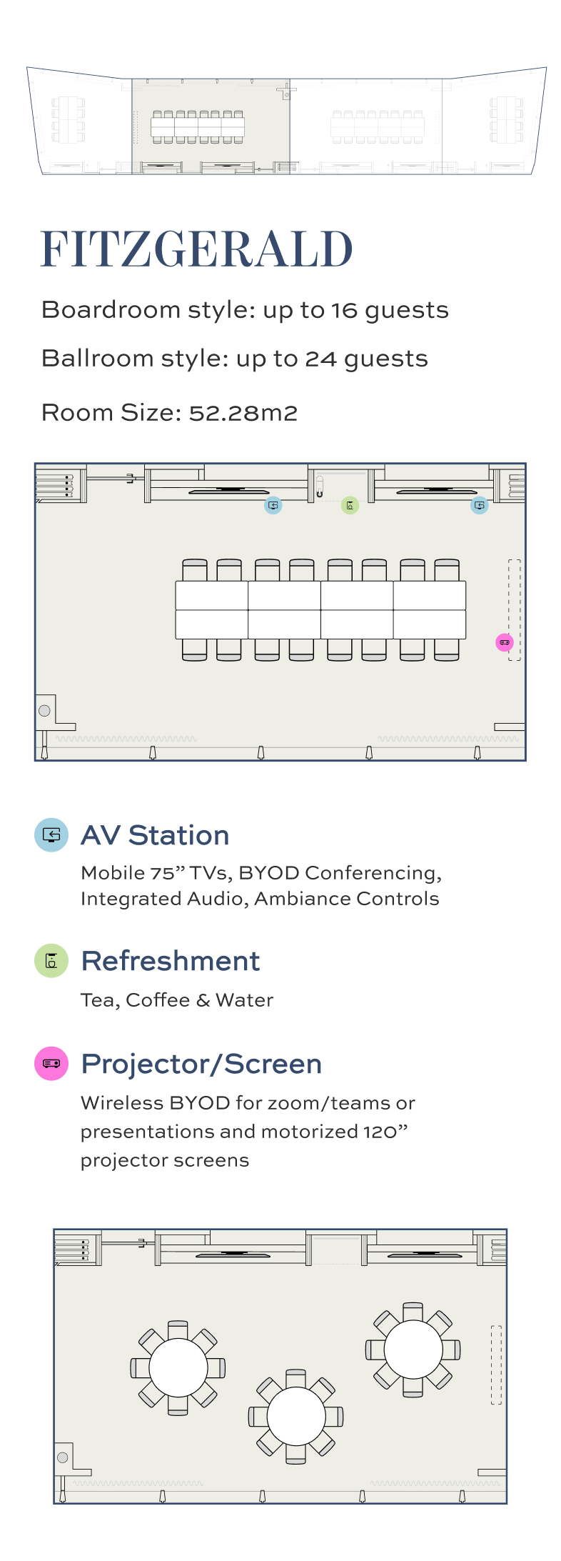 With vibrant design accents, blackout curtains for focus and privacy, and full audiovisual capabilities, the Fitzgerald room strikes the perfect harmony between function and flair.